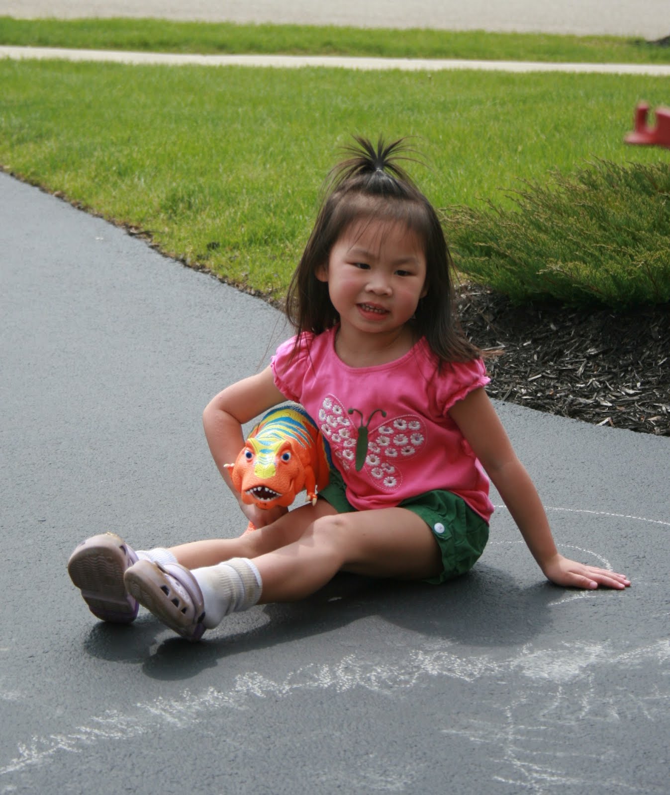 Jaden has always been a dinosaur lover! We have tons of dinosaur toys and books. She can look through the book and pick out the main dinosaurs and tell us what they are. Now that the weather is good the dinosaur box had moved outside. This week Jaden decided she wanted to make a dinosaur village on the driveway. So after a little chalk and mommy's wonderful artistic abilities she had her village! The only thing missing was the train tracks so Jaden got busy doing that herself!
